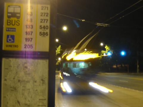 Today ended up being a very art-shot happy day with my camera. It started with this unusual convergence of plant and fence. Much later, waiting for the bus and trying not to fall asleep I started playing with the long exposure nightshot mode and had fun with motion blur. Bus arriving, bus motion lines. I really enjoy the lighting in nightshots. The angle and the intensity are all wrong. It makes everything look otherworldly, particularly weird decorative columns. Finally, a block from home there is a crosswalk with an illuminated crosswalk sign hanging above it. Standing in the middle of the road I was able to get this shot of its weird buzzing underbelly.