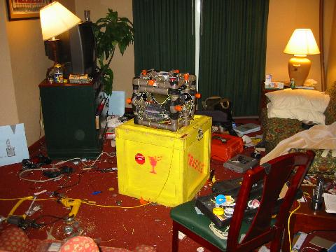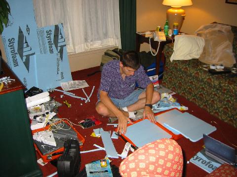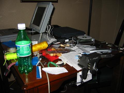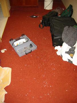 Dremel tool, aluminum chips and dust on the floor of the designated loud noise area: Dymaxion's and my bedroom