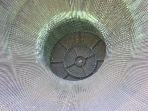 Combustion chamber on one of five giant F-1 engines, with injection port and combustion instability fighting baffles visible