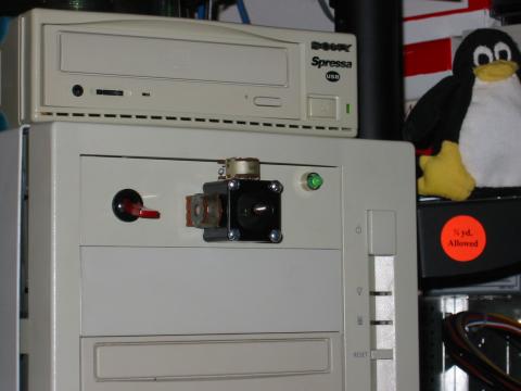 Some time ago I made an mp3 control panel. A drive bay cover with a play/pause switch and a prev/next switch, hooked up to the parallel port, with some simple software to send commands to the DJ. And it worked pretty well -- being able to reach up and pause the music or skip to the next song is very convenient. Except the play/pause switch wasn't momentary, so there were state synch issues if the web interface was used. And I started to wish I could at least play/pause the VJ in the same way.