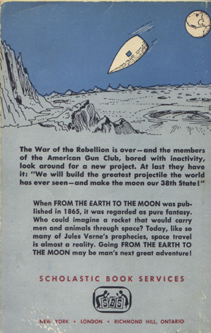 I'm currently reading Jules Verne's From the Earth to the Moon. I've had the copy so long that I don't remember where it came from, it's just one of those books that I've always had. It was printed in 1965, on its one hundredth anniversary. this is the front cover -- a nice 60s illustration of an 1860s concept. More amusing is the blurb on the back cover, particularly the last line. It frames the book as a neat little slice of history, stuck somewhere in between science-fiction and science-fact.
