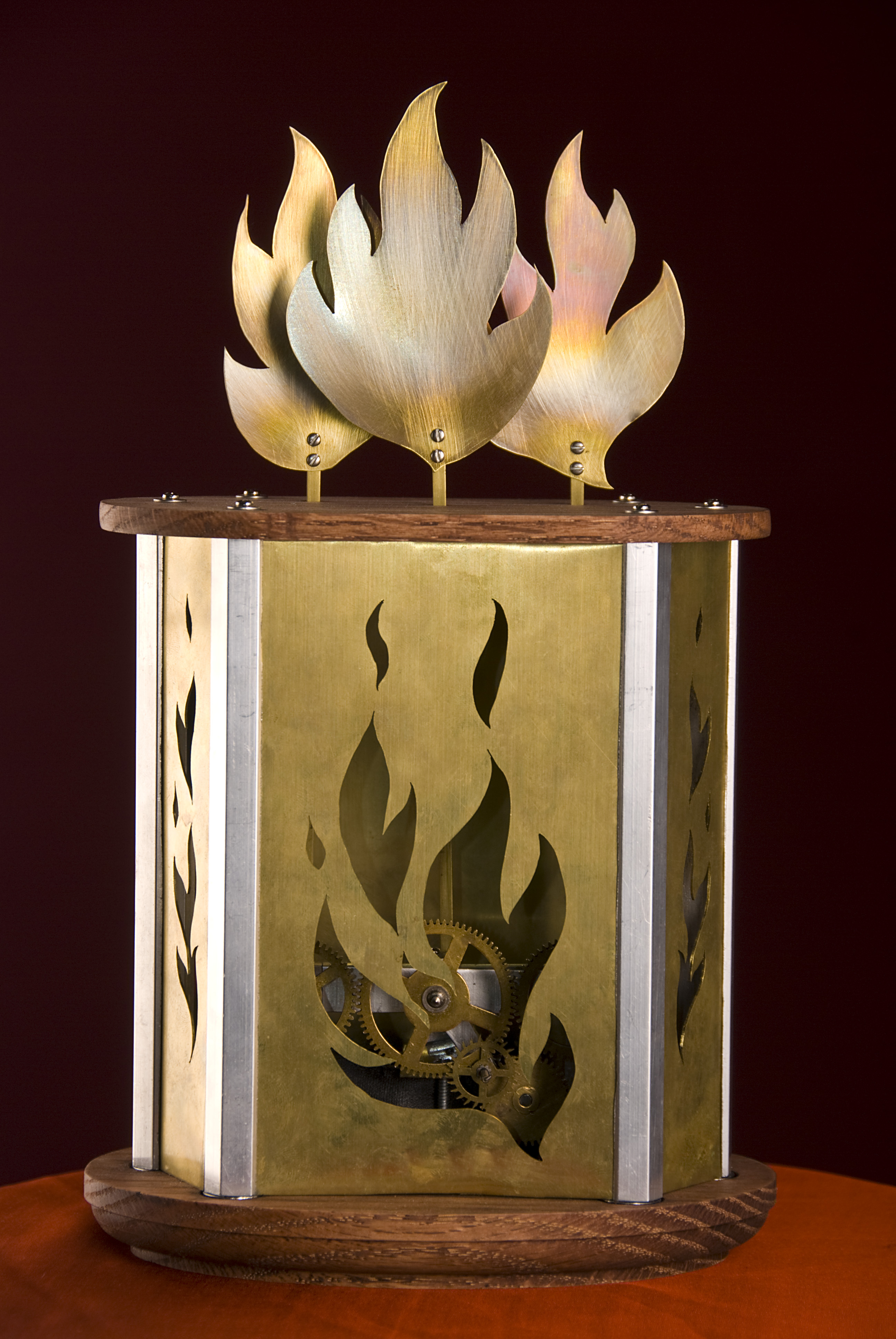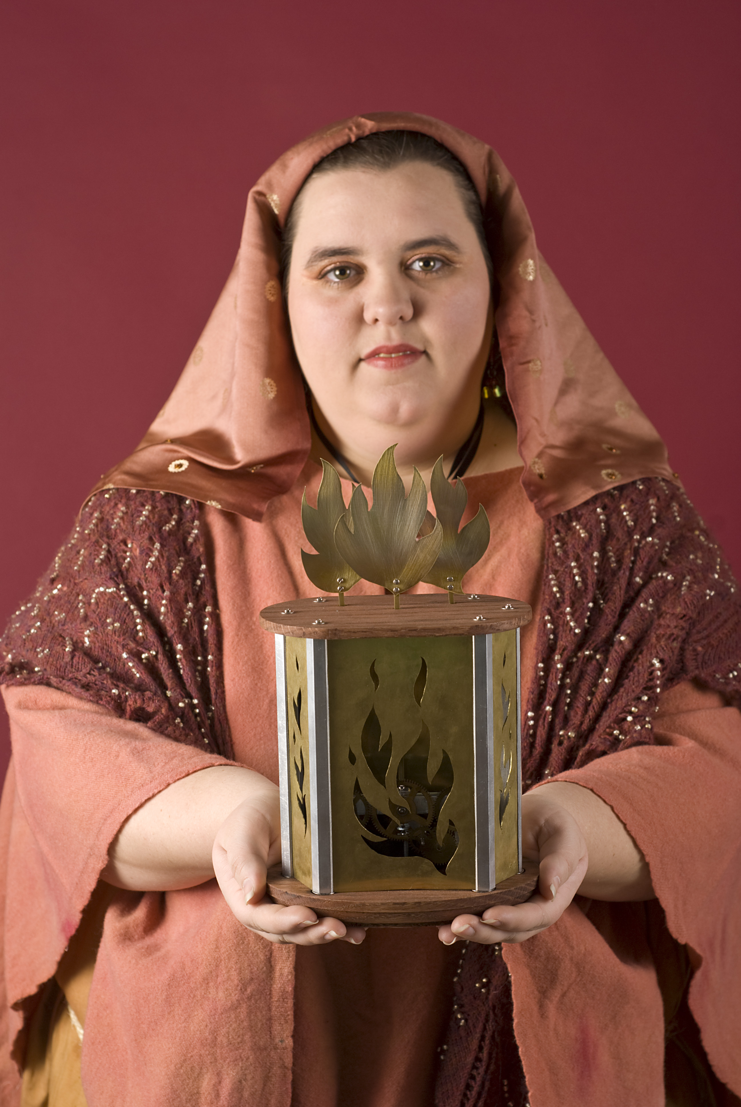 ladyaraia's use in the Spring Mysteries Festival and the big reveal belonged to her. She needed a representation of fire as a stage prop, something that would look good outside during the day. After toying with the idea of an arc lamp (which would have severe thermal issues and require a backpack-mounted battery array), I naturally went for a mechanical device with lots of gears and brass. I mean, of course!