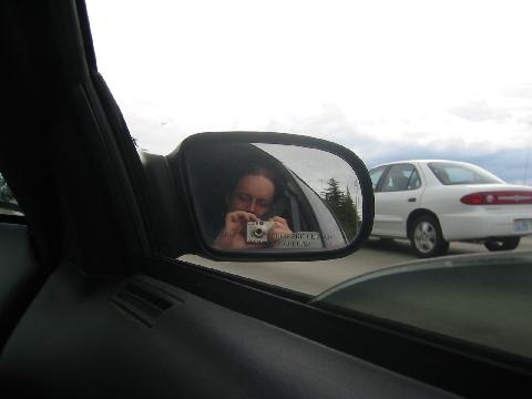 cria_cow and I drove down to Portland. Being horribly vain, I took this self-portrait on I-5. (I love how very northwest the image is. Foggy sky, evergreens visible in the mirror, and a plane just taking off from Boeing Field in the background.) In Portland we met up with